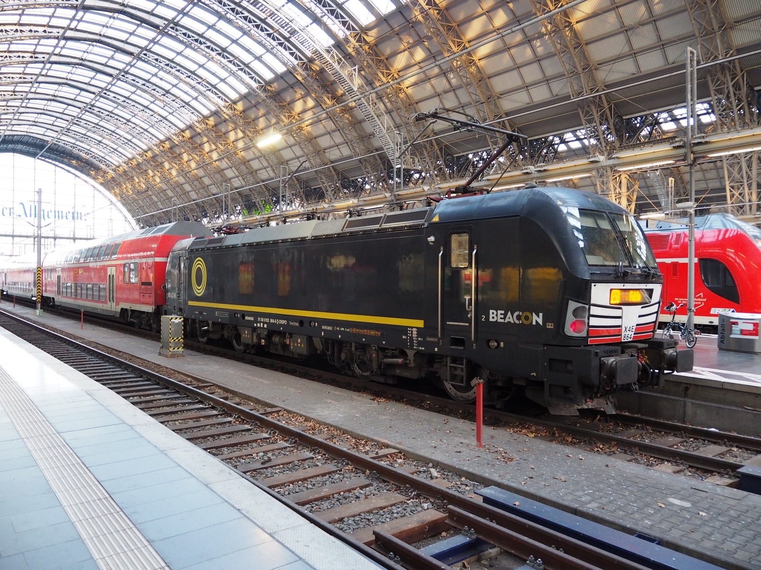 Gestern früh standen zwei Dispoloks von Beacon vor zwei RE in der Halle des Frankfurter Hauptbahnhofs.