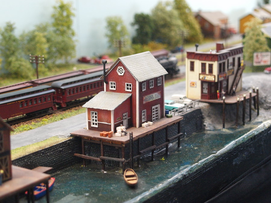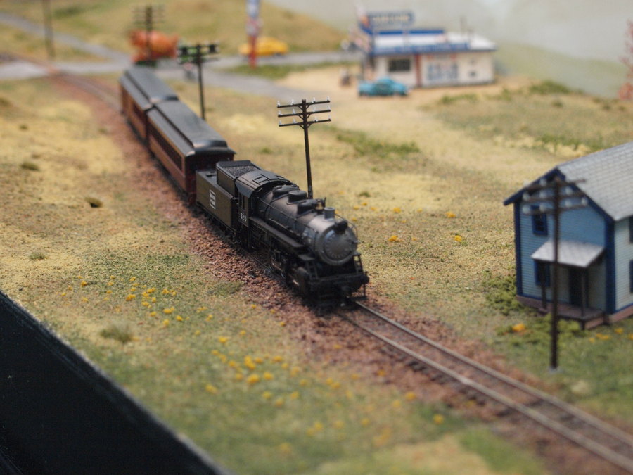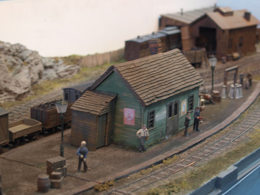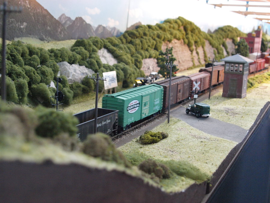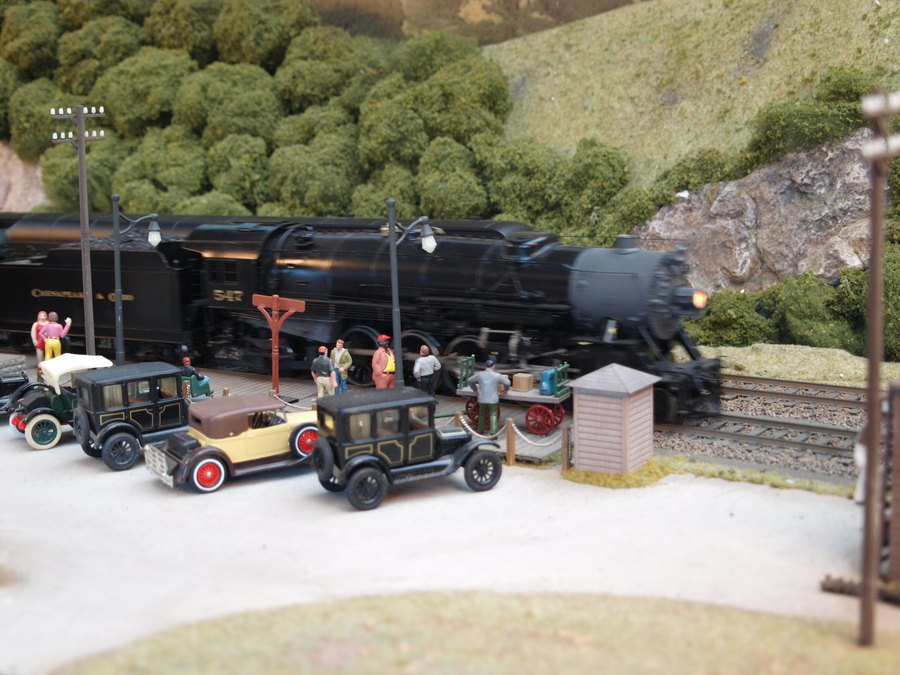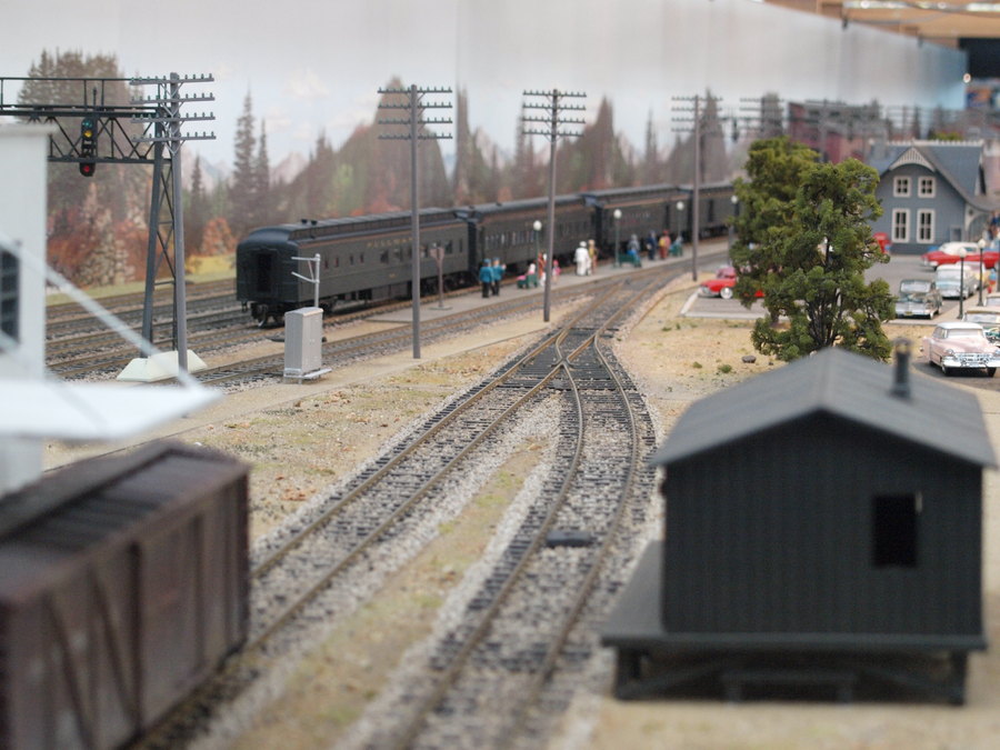 Zu sehen war eine große Anlage nach amerikanischem Vorbild in Baugröße 0. Beeindruckend fand die sowohl die Gestaltung der Längsseiten der Anlage als auch die Länge der eingesetzten Züge. Die großen Modelle versprühten Kraft und man konnte spüren, wie die Lokomotiven vor den Zügen arbeiteten. Auf einer Längsseite der Anlage war ein kleine Landbahnhof zu sehen, auf der anderen Seite ein kleinstädtischer Bahnhof mit Bahnbetriebswerk.
