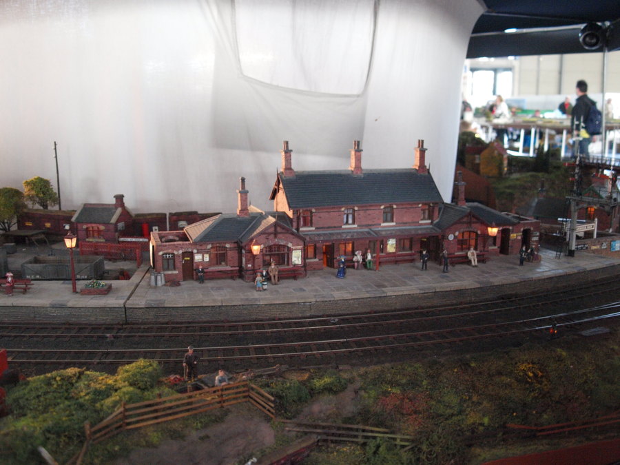 Die Baugröße 0 scheint sich immer mehr zum Renner für Ausstellungsanlagen zu entwickeln. Dieses Mal gab es eine Nebenbahn zu sehen, die von einem Fiddleyard über einen kleinen Haltepunkt in einen zweigleisigen Bahnhof führte. Zwischen Haltepunkt und Bahnhof überquerte die Bahn noch einen kleinen Fluss.