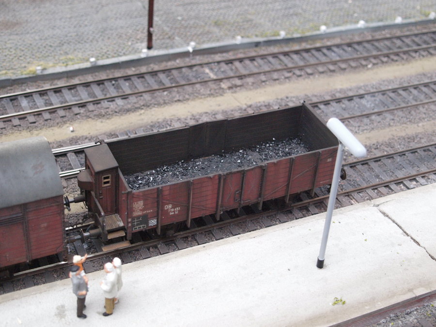 Die Erbauer dieser Anlage legen nicht nur Wert darauf, dass Landschaft und Gebäude stimmig sind, sondern altern auch ihre Loks und Wagen, so dass diese wirklich wie Nachbildungen ihrer Vorbilder wirken.