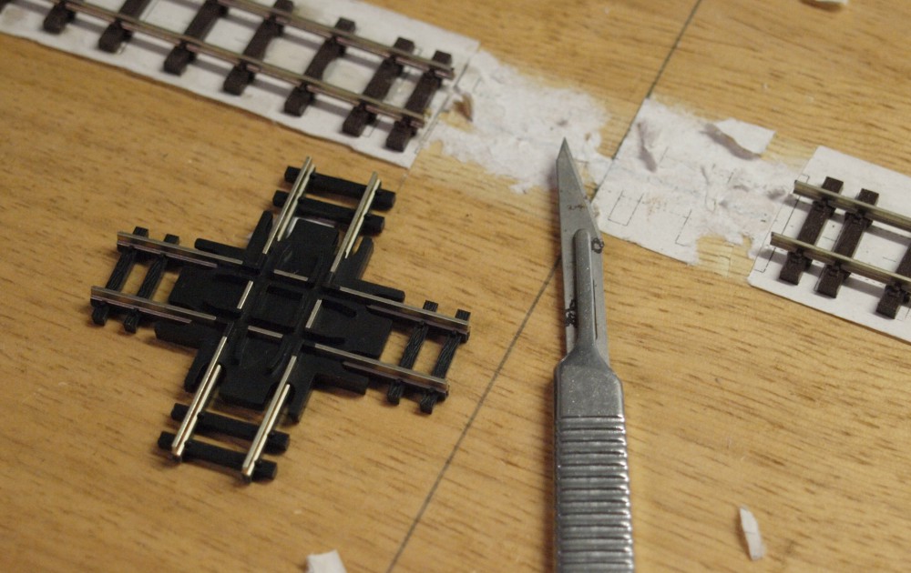 Als erstes habe ich die Kreuzung an allen vier Enden gekürzt und ein passendes Stück Gleis aus dem Schmalspurgleis heraus geschnitten.