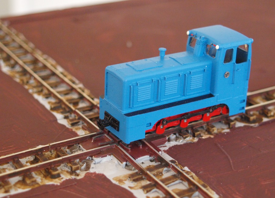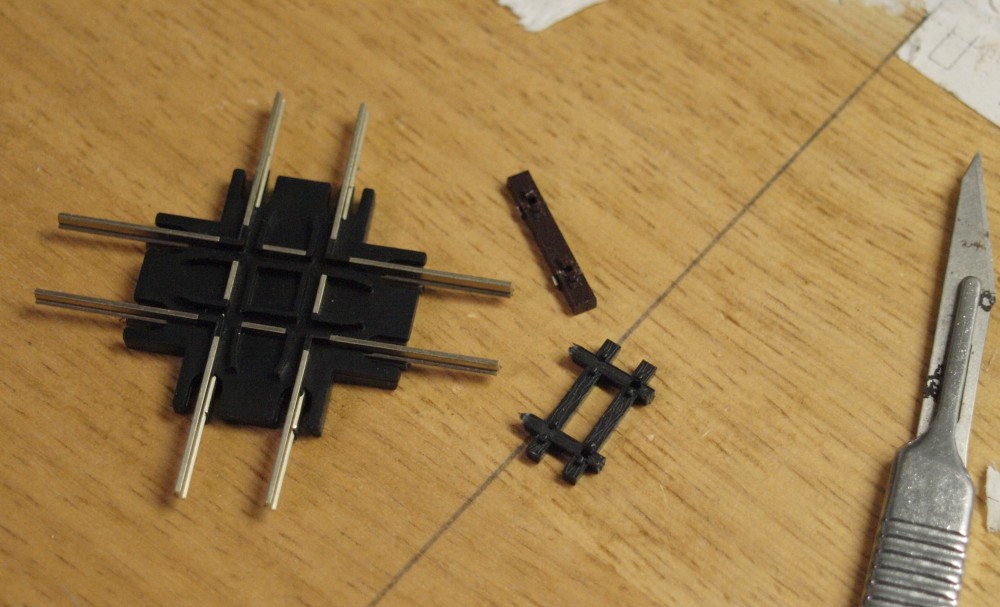 Die Schmalspurmodule sollten bis zum ersten großen Treffen des H0-Modellbahnforums fahrbereit sein. Dazu musste ich die Kreuzung der Schmalspurbahn mit der Feldbahn fertig stellen. Ursprünglich hatte ich geplant, die Kreuzung selbst zu bauen. Der erste Prototyp hat mich allerdings nicht so recht überzeugt, so dass ich mir eine 90° Kreuzung von Atlas mit Code 80-Gleisen in der Baugröße N besorgt habe.