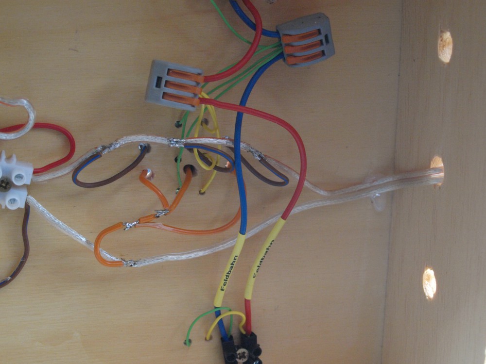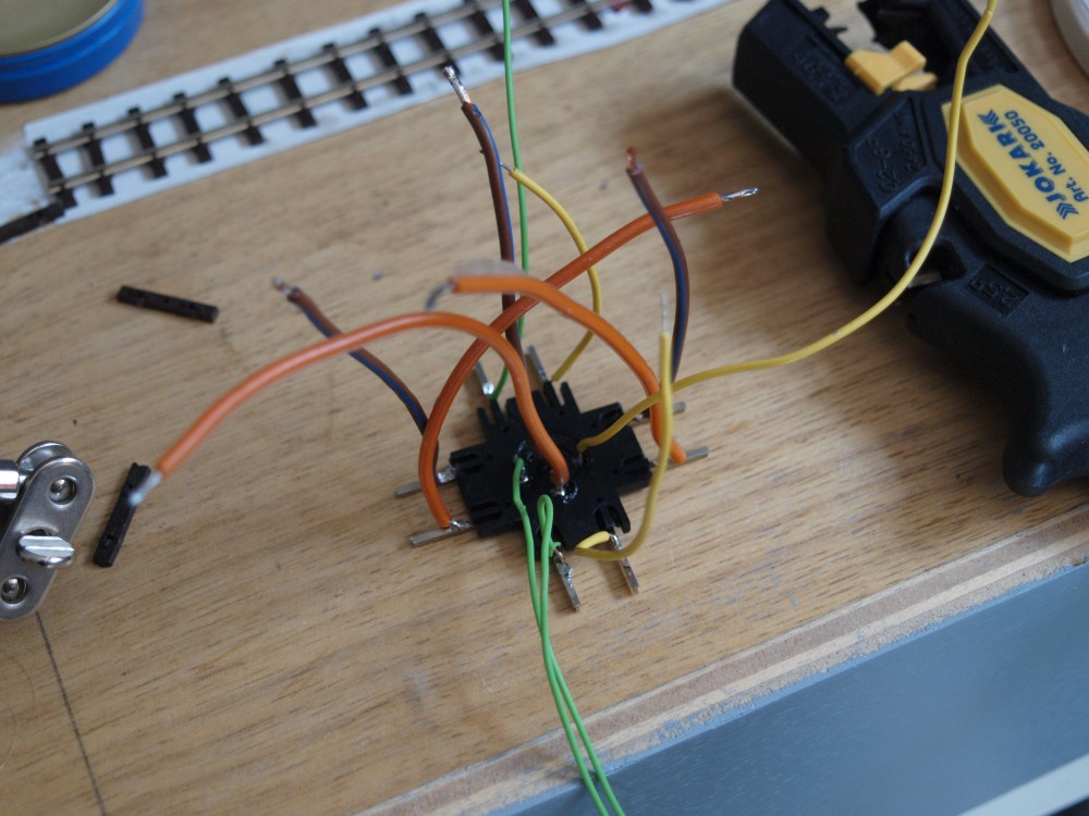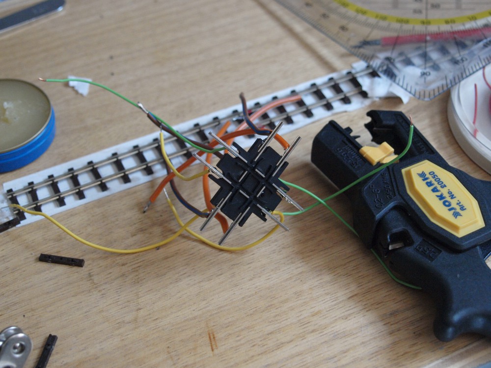 Die Verdrahtung der Kreuzung war ein wenig knifflig. Galt es doch, pro Richtung die abgehenden Gleise und die kleinen Schienenstückchen im Inneren der Kreuzung mit eigenen Anschlüssen zu versehen. Die Anschlusskabel für die Schmalspurbahn sind etwas voluminös geraten, das nächste Mal nehme ich nur die feinen Litzen, das lötet sich doch wesentlich angenehmer.