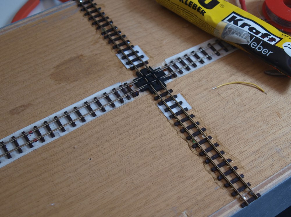 Kreuzung und Feldbahngleise habe ich danach in bewährter Art und Weise mit Kraftkleber direkt auf dem Modulkasten befestigt.