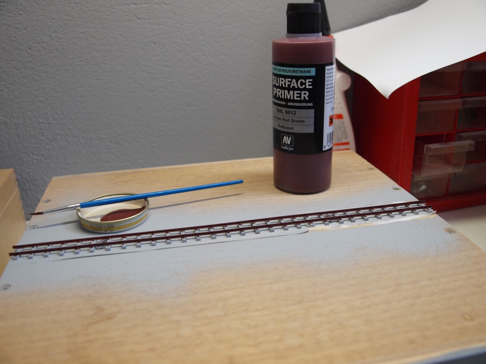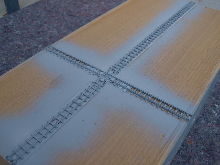 Die Gleise sind mit Grundierung aus der Sprühdose grau grundiert.