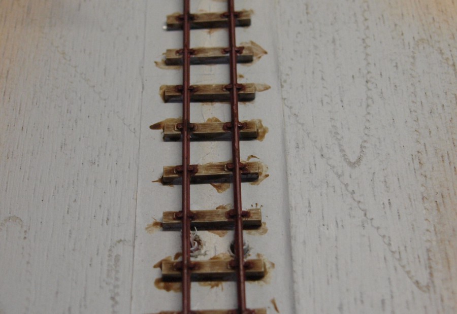 Die N-Schwellen sind viel zu kurz und zu Schmal für eine H0-Schmalspurbahn, also mussten sie ebenfalls dran glauben. Die Schwellen habe ich dann später durch passende Roco-Schwellen für die Schmalspurbahn und Peco-Schwellen für die Feldbahn ersetzt.