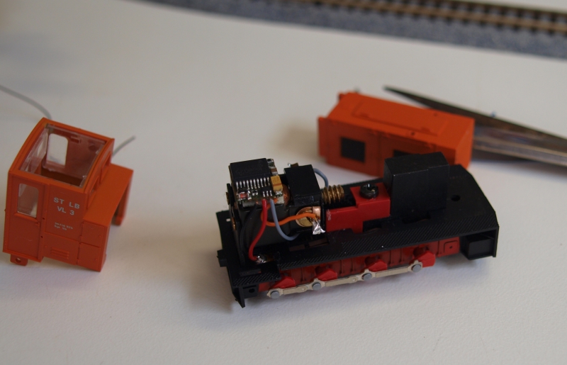 Das Anlöten der Kabel ging mit einem kleinen spitzen Lötkolben schnell vonstatten. Den Decoder habe ich abschließend mit zwei Stücken Klebepad auf dem Motor montiert und das Führerhaus wieder aufgesetzt. Durch die recht kleinen Fenster fällt die Elektronik nicht gar so sehr auf.