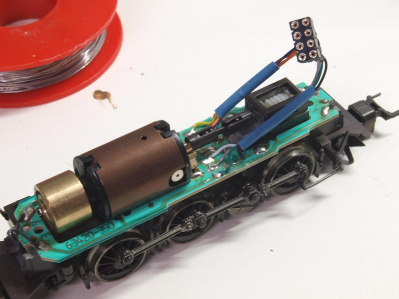 Achtpolige Schnittstellen zum selber Einbauen gibt es u. a. von Tams Elektronik zu kaufen. Als Decoder kommt ein vorhandener Lokpilot V3 zum Einsatz, der der Lok zu guten Fahreigenschaften verhilft.