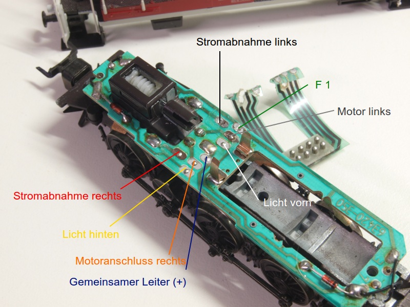 Bei dieser Lok hat Roco die Verbindung zwischen den Anschlüssen auf der Lokplatine und der achtpoligen Schnittstelle über flexible Leiterbahnen hergestellt. Eine genau Inaugenscheinnahme der auf Folie aufgedruckten Leiterbahnen förderte zwei Leiterbahnbrüche zu Tage, so dass klar war, warum die Lok nicht mehr funktionierte.