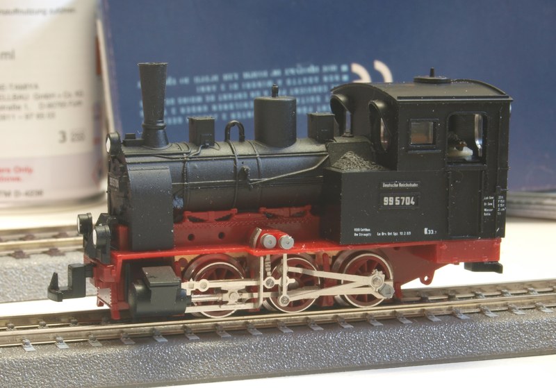 Die Spreewald-Lok 99 5704 von Tillig ist ein Klassiker aus den neunziger Jahren des zwanzigsten Jahrhunderts. Die Lok läuft analog einigermaßen annehmbar und ist bis auf die etwas plastikhafte Anmutung von Fahrgestell und Anbauteilen gut gelungen.