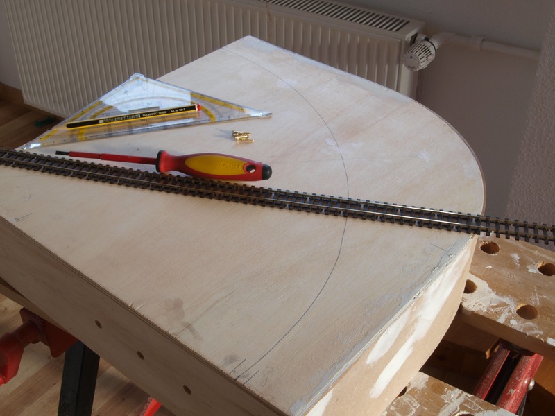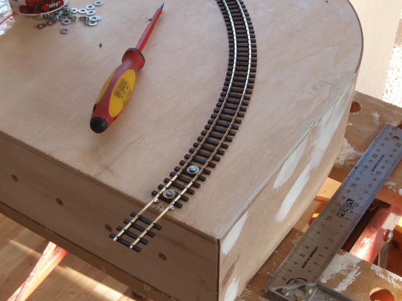 Jetzt kommt nur noch das Gleis drauf und ein paar Kabel drunter. Zunächst haben wir leicht zittrig mit einem Schnurzirkel den Radius von 35 cm angezeichnet und Messingschrauben zur Gleisbefestigung an den Modulübergängen eingedreht.