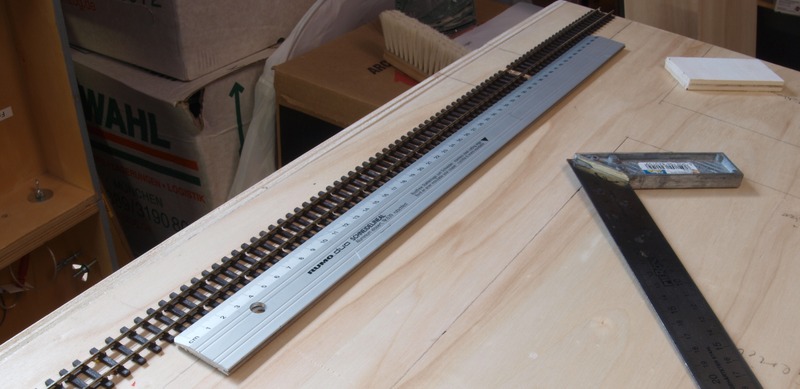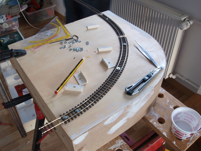 Das Gleis ist bis zum Abbinden des Klebers mit einigen Schraubzwingen belastet worden, damit es wirklich plan aufliegt.