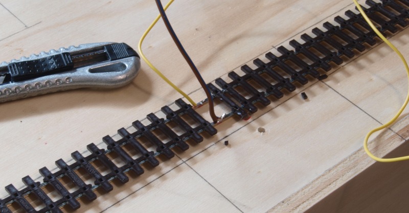 Nach und nach haben wir das Gleis -- wir haben H0m-Flexgleis von Peco verwendet, das sich ausgezeichnet verarbeiten und löten lässt -- gebogen und mit Schrauben und Muttern gesichert. Nach dem Anlöten des Gleises auf der anderen Seite (dazu waren zwei Versuche nötig, beim ersten Anlauf war ein Knick im Gleis) und dem Anschluss der Kabel war schon zu sehen, was das einmal werden sollte: