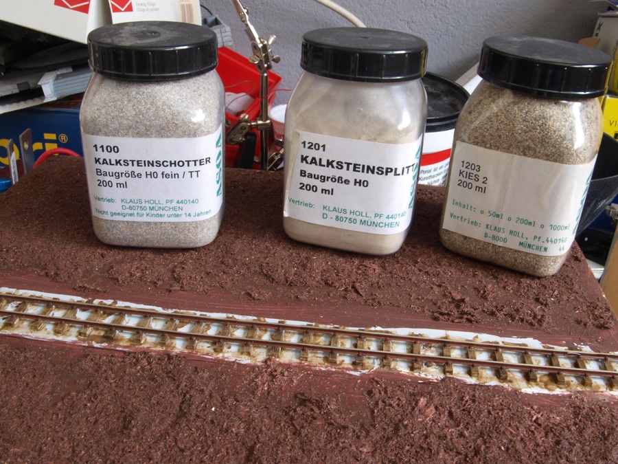 Den Anfang macht das 30cm lange Streckenmodul, auf dem ich das Schottern und Begrasen geübt habe. Der Schotter stammt von ASOA. Ich bringe den Schotter mit Eierlöffeln auf und kehre ihn dann mit einem feinen Pinsel in die Schwellenfächer: