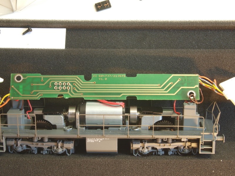 Jetzt war die Zeit gekommen, die Lok mit einem anständigen Decoder und korrekt funktionierender Beleuchtung auszustatten. Die Lok hat blöderweise noch leuchtend gelbe LEDs eingebaut. Ich habe daran nichts geändert weil die Platinen, auf denen die Dioden montiert sind, verklebt sind. Möglicherweise gibt es ja irgendwann mal wieder die aktuellen Beleuchtungsplatinen für die MaK von Märklin/Trix als Ersatzteil, dann würde ich die noch austauschen. Mit ein bisschen Dimmen werden die Lampen aber auch erträglicher.