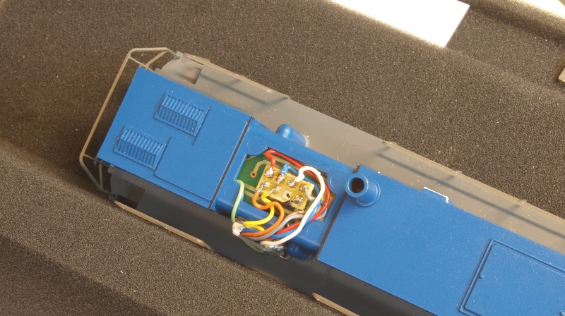Jetzt war die Zeit gekommen, die Lok mit einem anständigen Decoder und korrekt funktionierender Beleuchtung auszustatten. Die Lok hat blöderweise noch leuchtend gelbe LEDs eingebaut. Ich habe daran nichts geändert weil die Platinen, auf denen die Dioden montiert sind, verklebt sind. Möglicherweise gibt es ja irgendwann mal wieder die aktuellen Beleuchtungsplatinen für die MaK von Märklin/Trix als Ersatzteil, dann würde ich die noch austauschen. Mit ein bisschen Dimmen werden die Lampen aber auch erträglicher.