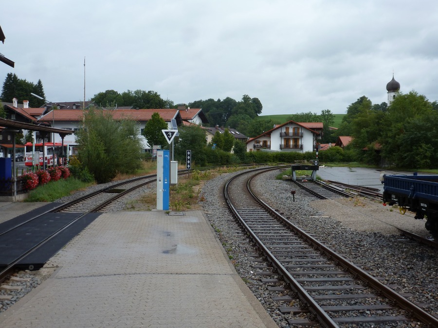 In Richtung Schaftlach steigt das Streckengleis gleich stark an, die erste Weiche des Bahnhofs liegt schon in der Steigung.