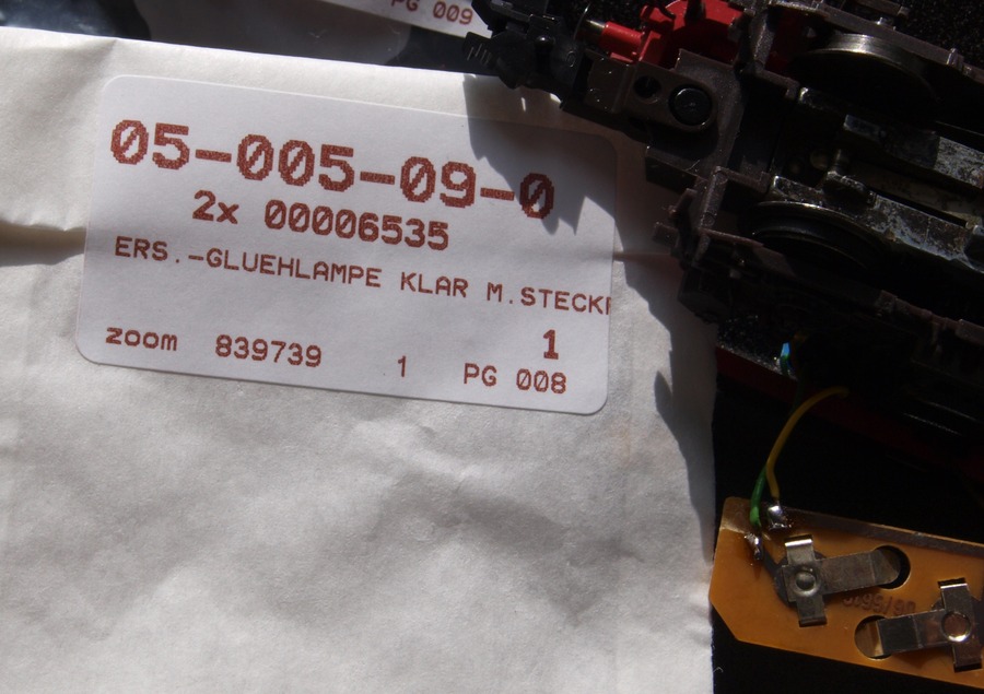 Von Fleischmann gibt es unter der Bestellnummer 6540 einen Beleuchtungszurüstsatz für die BR 218. Enthalten sind Kontaktfedern und Lämpchen, die für den Zugschluss gebraucht werden. Da der Umrüstsatz nicht lieferbar war, habe ich mir zwei Lämpchen (Best-Nr 6535) und zwei Ventilzellen (Best-Nr 6444) bestellt und diese Teile dann verbaut.