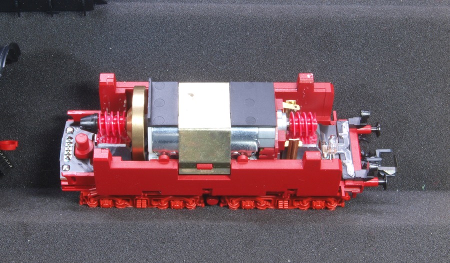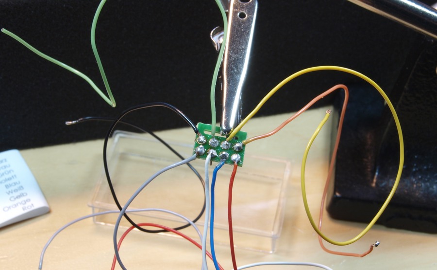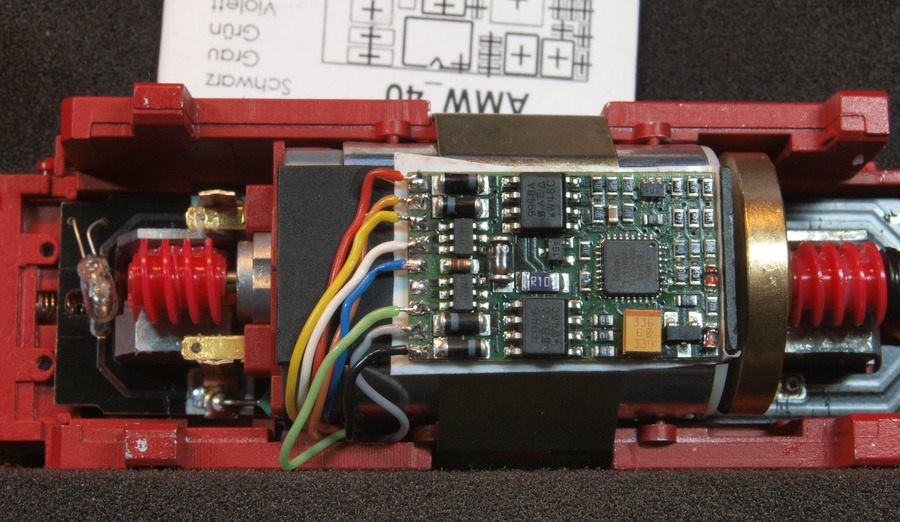Mein Modell hat schon eine Schnittstelle, die Roco aber unter dem Motor angeordnet hat. Zum Digitalisieren der Lok muss also der Motor ausgebaut werden. Danach habe ich Decoderkabel an einen überzähligen achtpoligen Schnittstellenstecker gelötet und dann passgenau an den Decoder, einen AMW40, gelötet, so dass keine losen Kabel im Inneren des Tenders herumfliegen.
