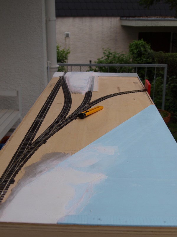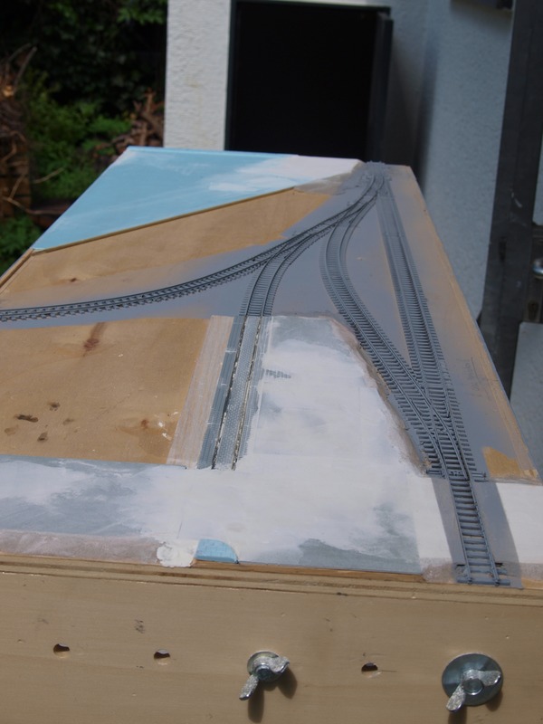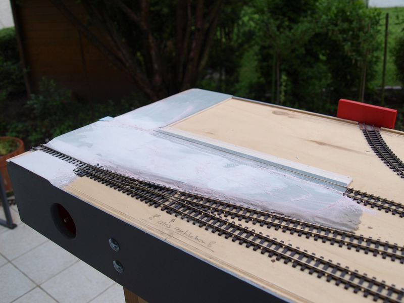 Und weil das Wetter heute so schön war und das Modul ohnehin auf der Terrasse stand, habe ich auch gleich noch die Gleise des Brauerei-Moduls und des Bogens grundiert.