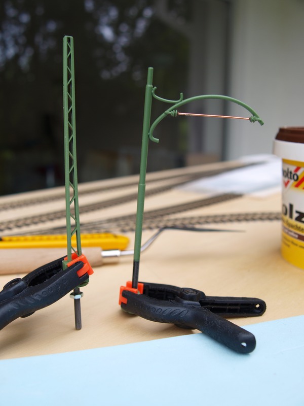 Die Oberleitungsmasten haben wir letzten Monat mit Lack aus der Dose Resedagrün lackiert