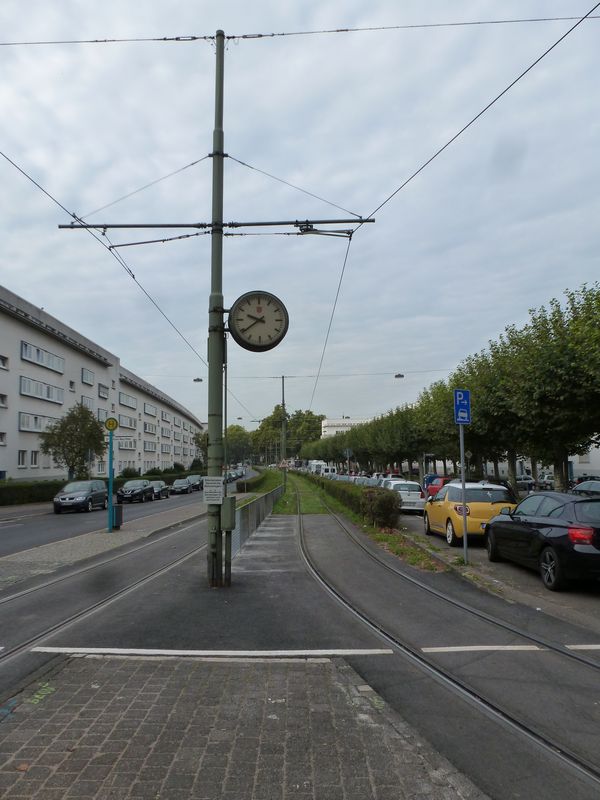 An der Ausstiegshaltestelle steht ein interessanter Fahrleitungsmast mit Uhr: