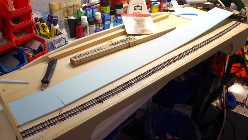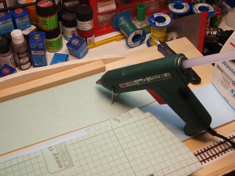 Hinter der Straße auf dem Durchtauchmodul liegt ein kleiner Hügel, den ich ebenfalls aus Hartschaum hergestellt habe. Die einzelnen Schichten habe ich mit Heißkleber zusammen geklebt, das hält prima und ist schnell fest.