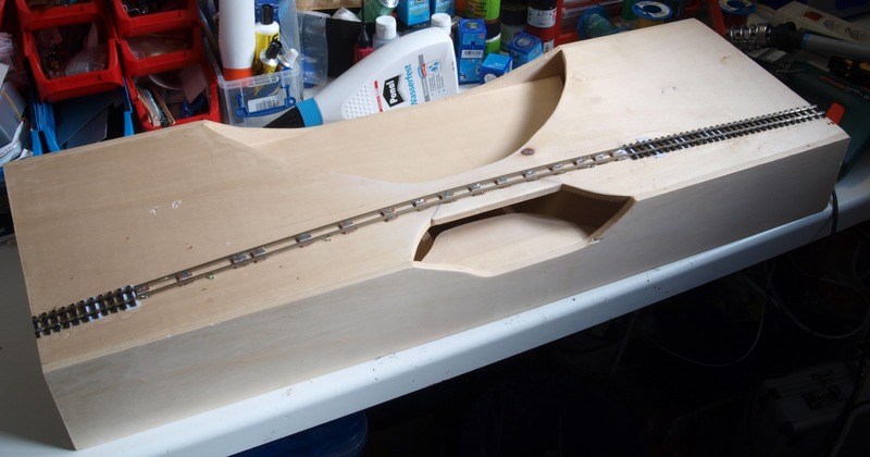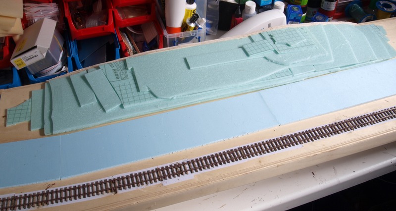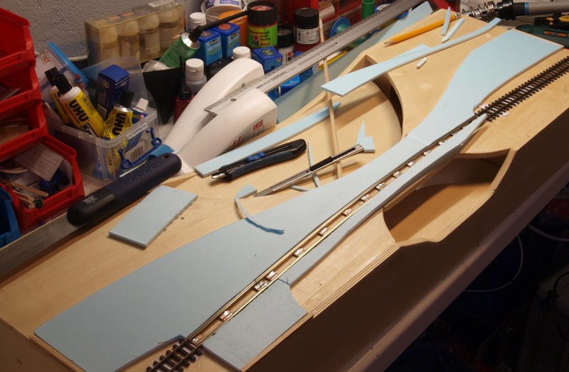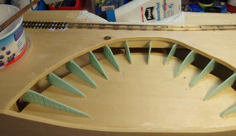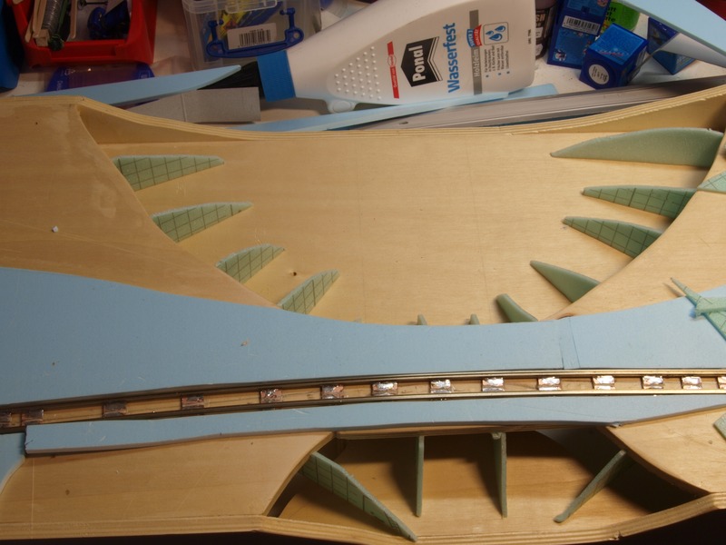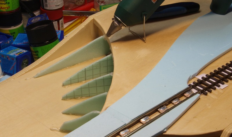 Für die Landschaft habe ich mir bei diesem Modul etwas anderes überlegt. Ich habe Spanten aus Hartschaum geschnitten und darauf in Weißleimwasser getränkte Küchentücher gelegt. Die Spanten habe ich wieder mit Heißkleber befestigt.
