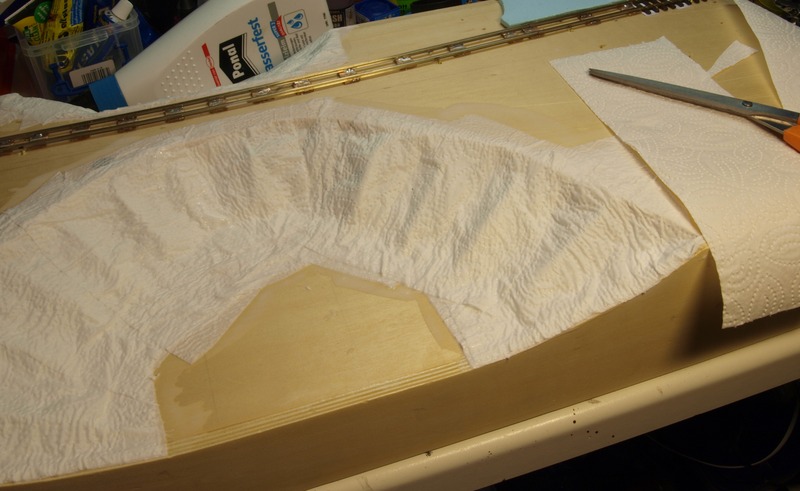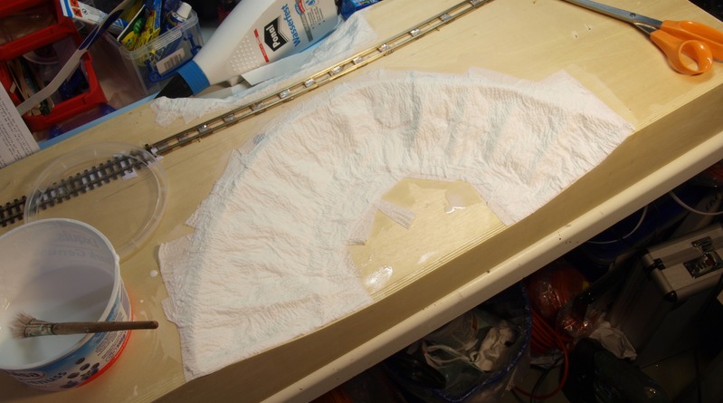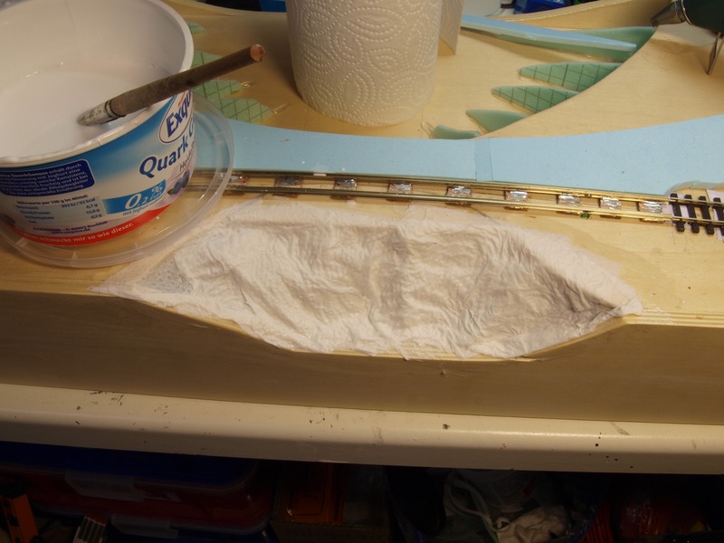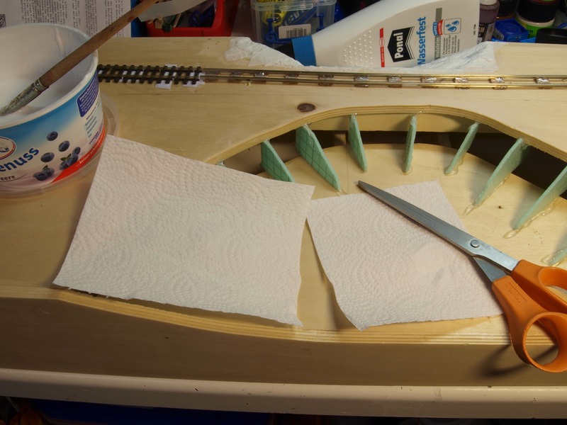 Das Leimnwasser ist etwas "dicker" angerührt als zum Kleben von Schotter. Vier bis fünf Lagen Küchentücher bilden eine recht feste Haut.