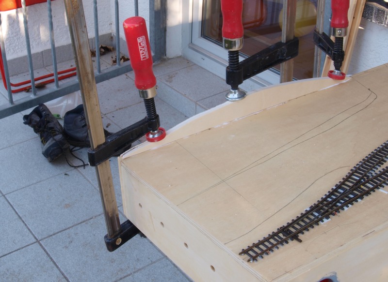 In Vilvenich sollte auch ein kleiner Hügel entstehen, die Abgrenzung habe ich aus einem Sperrholzbrett geschnitten und aufgeleimt.