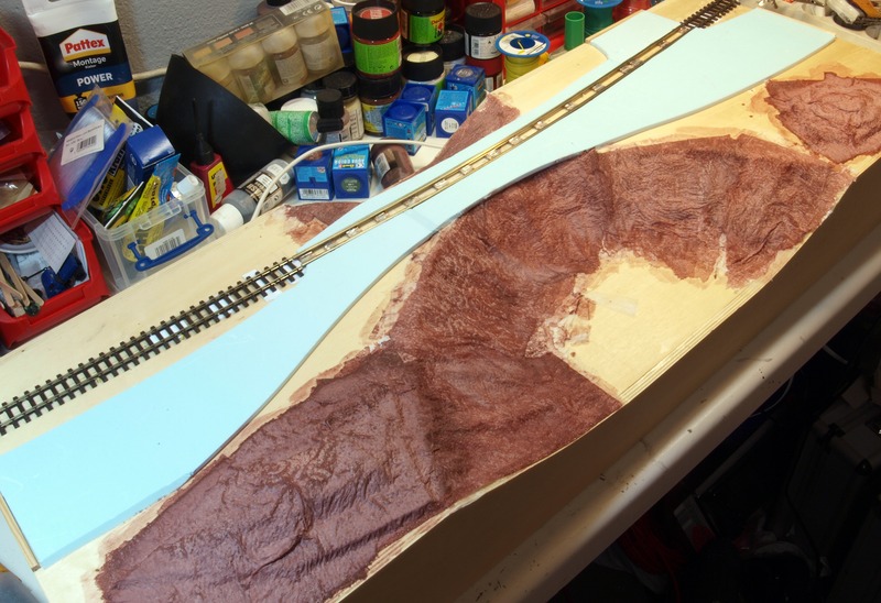 Jetzt muss die Geländehaut trocknen, dann kann ich die Modulkästen spachteln, schleifen und lackieren.