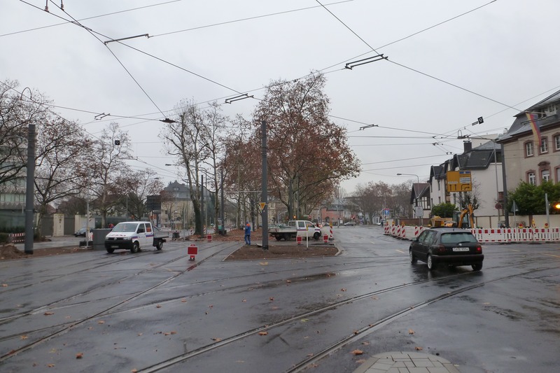 Auf den folgenden Bildern ist die Verknüpfung der Neubaustrecke mit der alten Strecke an der Ecke Stresemannallee/Mörfelder Landstraße zu sehen.
