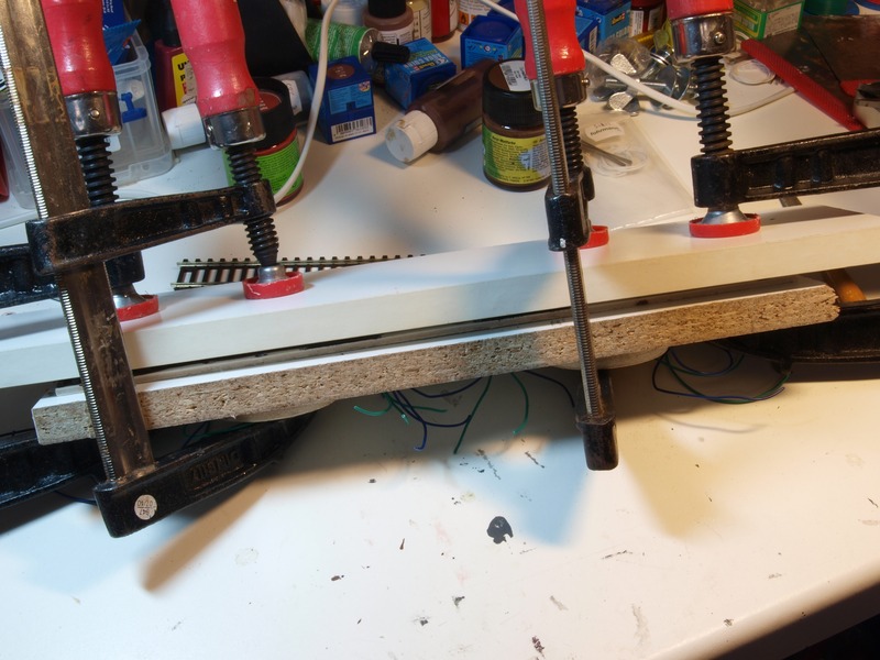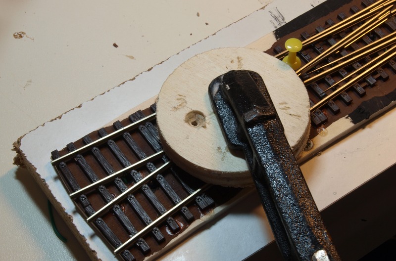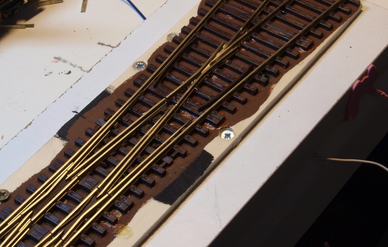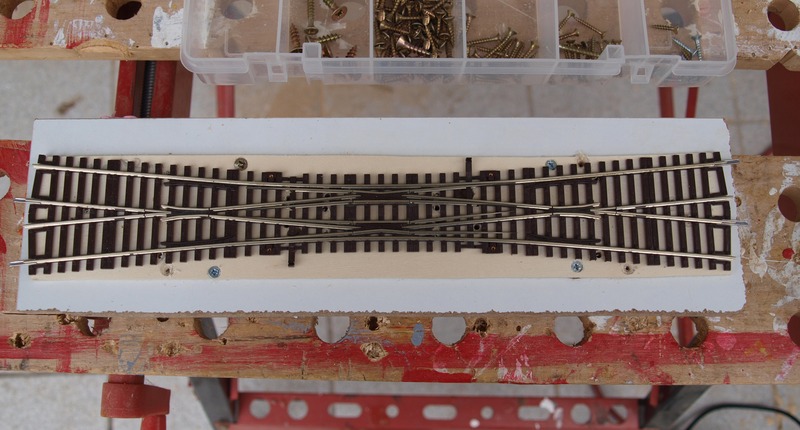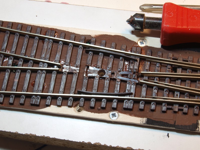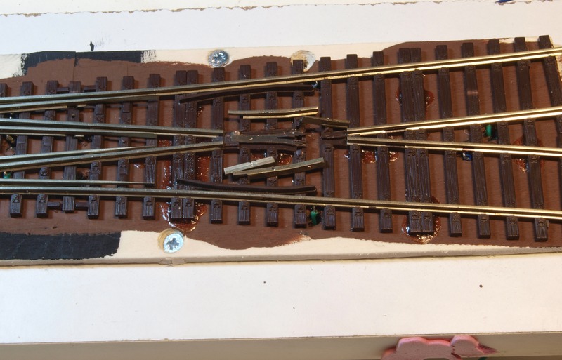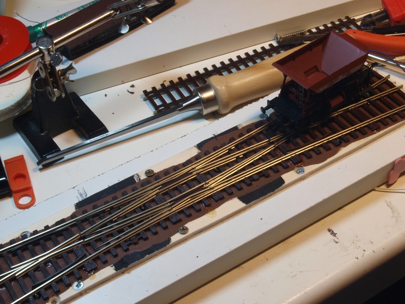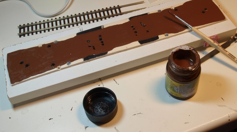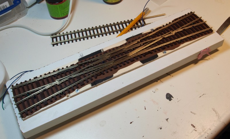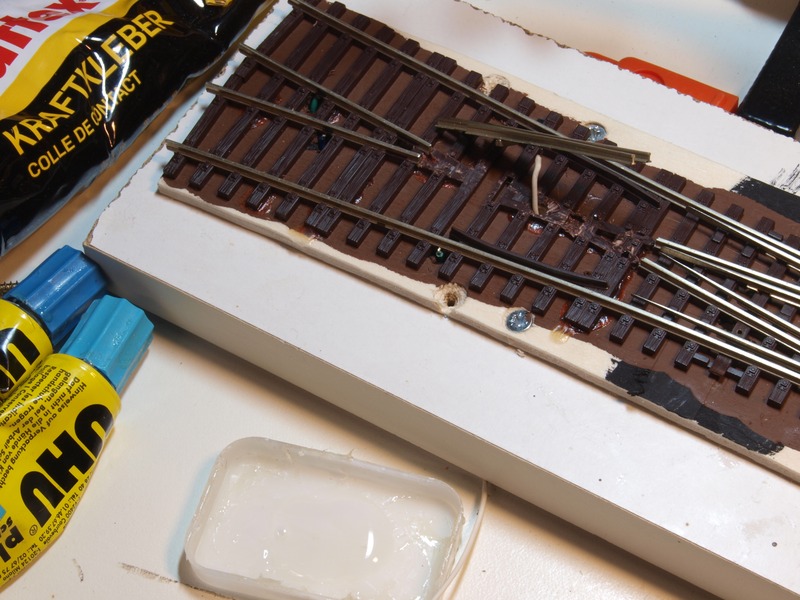 Nachdem klar war, dass die Weiche wirklich plan auflag, habe ich das Brett unter der Weiche braun gestrichen und die DKW mit Kraftkleber auf das Brett geklebt.