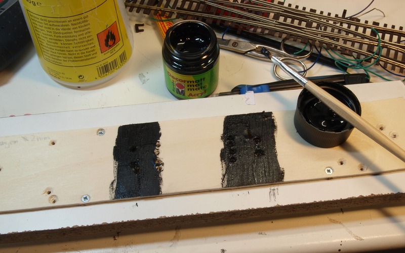 Damit die Bohrungen für die Stelldrähte nicht zu auffällig sind, habe ich sie auf der Oberseite mit Papier bis auf einen Schlitz abgeklebt und die Umgebung schwarz lackiert. Die Bohrungen für die Kabeldurchführung habe ich auf der Oberseite angesenkt, damit der Schwellenrost plan aufliegt.