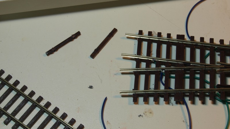 Die beiden letzten Schwellen an der DKW haben Aussparungen für Schienenverbinder. Die Schwellen habe ich entfernt und durch normale Schwellen ersetzt. Die Befestigungsmuttern für die Weichenantriebe lassen sich einfach ausklipsen entfernen, dann habe ich die Schienenprofile verzinnt.
