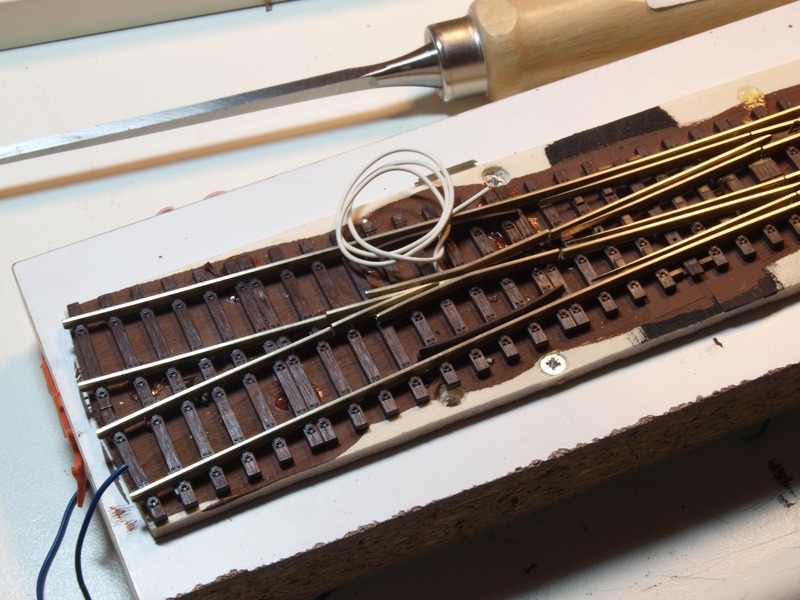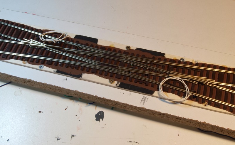 Neben dem Austausch der Herzstücke habe ich bei der DKW auch noch jedes Stückchen Gleis und jede Zunge mit einem Anschlussdraht versehen, damit es nicht zu Kontaktschwierigkeiten kommt.