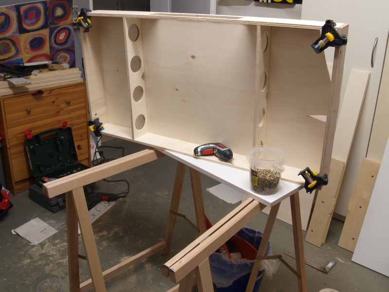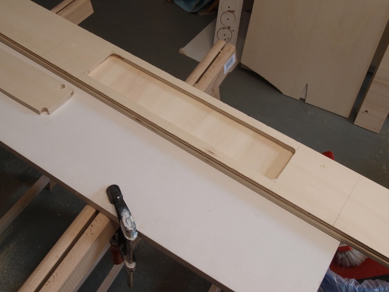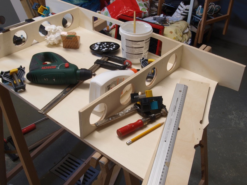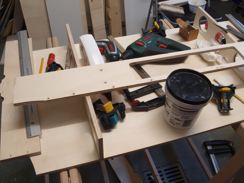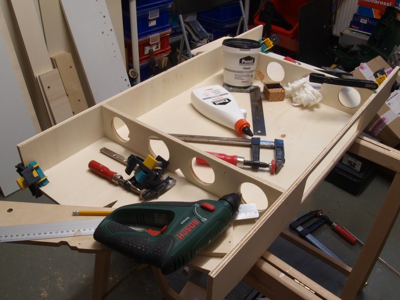 Wenn morgen der Leim getrocknet ist, werde ich die Ablage einbauen, den ganzen Kasten von innen und außen grundieren und demnächst auch mit der Gleisverlegung beginnen. Zum Jahrestreffen dann ist der Bahnhof Bischofsheim in voller Länge befahrbar.