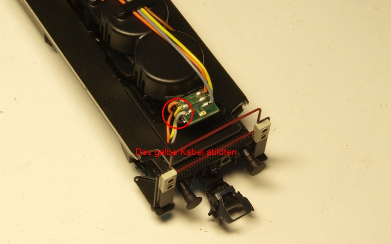 Auf beiden Lokseiten wird die gelbe Leitung, die zu den Zugschlussleuchten führt, abgelötet und mit einem dazwischen gelöteten Widerstand direkt mit den Anschlüssen von AUX1 (Lokseite 1) und AUX2 (Lokseite 2) an der 21poligen MTC-Schnittstelle verbunden.