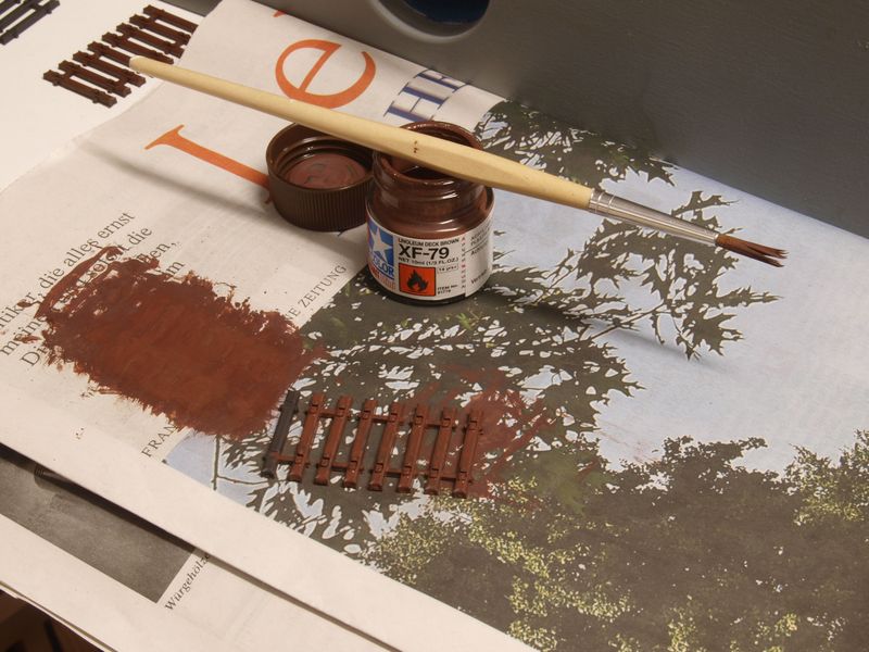Ich habe in Vilvenich und auf dem Tauchmodul mit dem Selbstbaugleis die Straßen grundiert, die Landschaftshaut vervollständigt und die Gleise eingeschottert. Zum Schottern habe ich wieder den braunen Schotter von Minitec verwendet weil ich ein etwas heruntergekommenes Gleis darstellen will, das schon eine Weile liegt.
