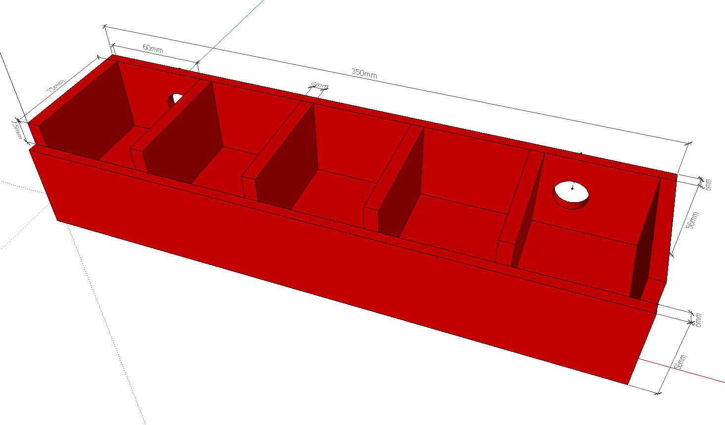 Der erste vorzeigbare Entwurf zeigt eine Kiste für Wagenkarten und Frachtzettel. Die Wagenkarten bei der Forumbahn des H0-Modellbahnforum sind 54x89mm groß. Meine Kiste hat fünf Fächer für Karten. Der Kasten ist innen 50mm hoch, die Fächer sind 75mm tief.
