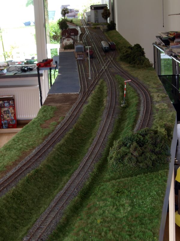 Die beiden folgenden Bilder zeigen den Bahnhof in ganzer Ausdehnung. Die Lichtverhältnisse waren alles andere als ideal. Die Bilder reichen aber, um einen Eindruck zu vermitteln, wie weit wir in der letzten Zeit gekommen sind. Das Empfangsgebäude, der Genossenschaftsschuppen und die Gleisfeldleuchte auf den Bildern sind nur Platzhalter für die richtigen Modelle.