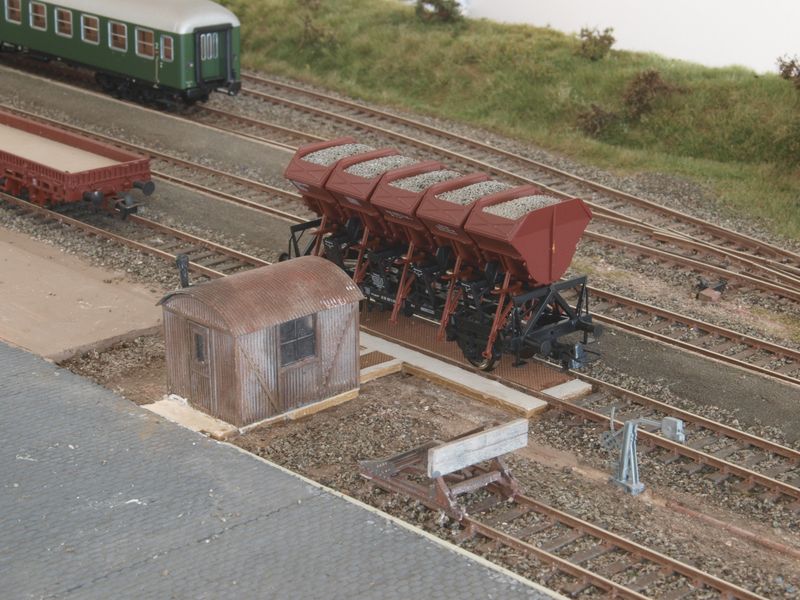 Neben ausgiebigen Funktionstests, bei denen uns meine Jüngste assistierte, indem sie mit einer 216 den ganzen Bahnhof immer wieder langsam abfuhr, haben wir viel geplant und die Gleiswaage an Gleis 1 eingebaut. Die Waage stammt aus einem Bausatz von MKB, das Wiegehäuschen ist ein Bausatz von Bemo.