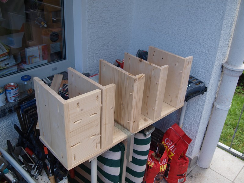 In der Garage standen noch ein paar Stücke Leimholz, die ich vor Jahren gekauft habe. Inzwischen habe ich vergessen, wofür das Holz gedacht war und so kam ich auf die Idee, aus den Resten, die beim Bau der Sägebank übrig geblieben waren, und dem frischen Leimholz ein kleines Regal zu bauen, das meine Sortierboxen mit dem Landschaftsbaumaterial aufnimmt.
