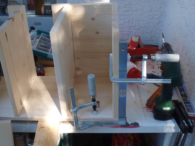 - Die Einzelteile müssen beim Verschrauben mit Schraubzwingen gegen Verschieben gesichert werden. Ein Boden ist beim Einschrauben leicht verrutscht und darum nicht genau im rechten Winkel.