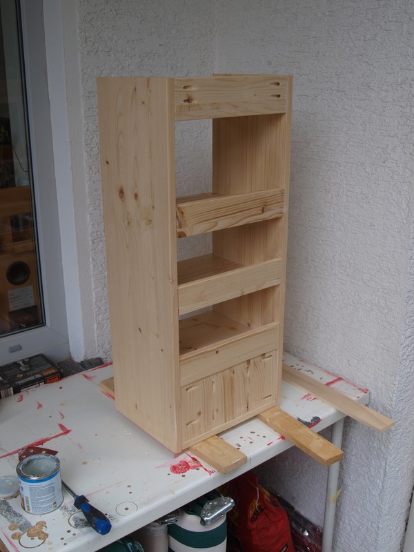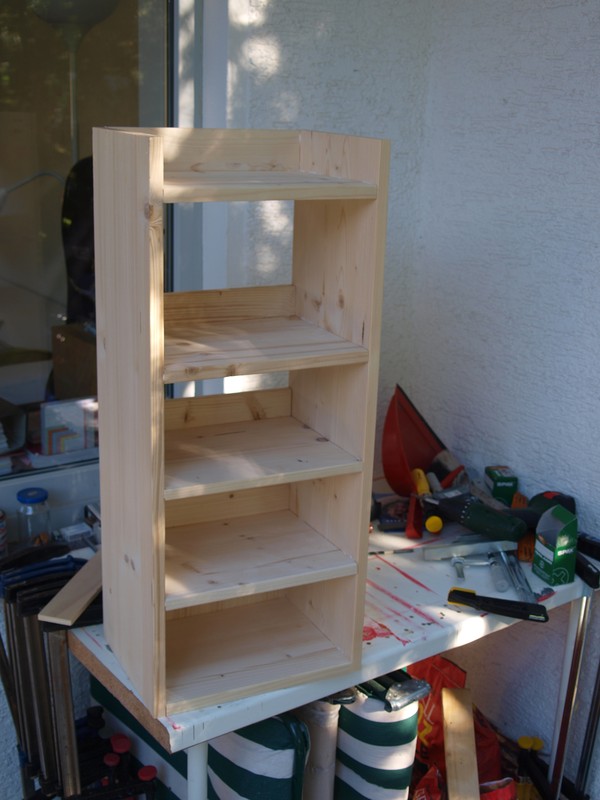Auf dem folgenden Bild ist das Regal probeweise trocken zusammen gesetzt. Die Bohrungen für die Taschenschrauben sind beim unteren Regalboden gut zu erkennen.