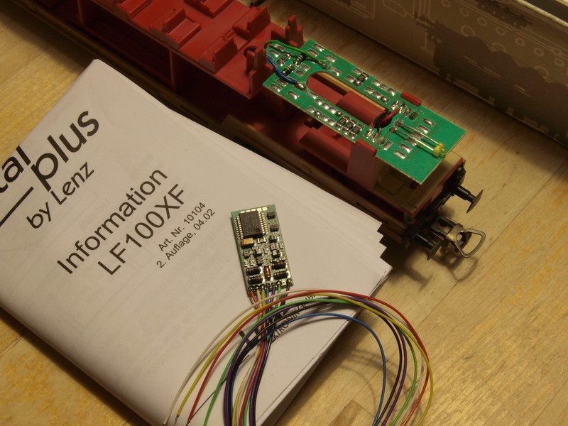 Der Preisaufkleber auf der Verpackung des Steuerwagens zeigte einen DM-Preis, so dass folgerichtig ein LF100XF von Lenz als Funktionsdecoder zum Einsatz kam. Es ist schon erstaunlich, wie groß die Bauteile auf den Decodern seinerzeit waren...