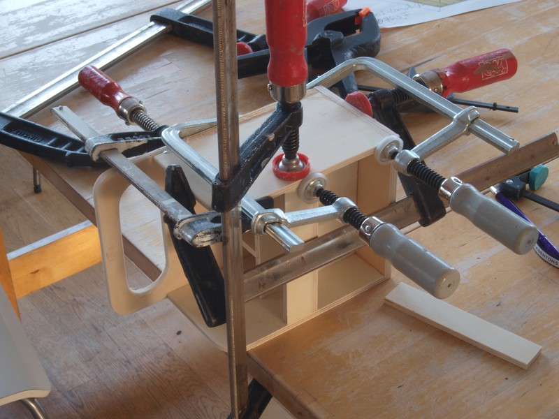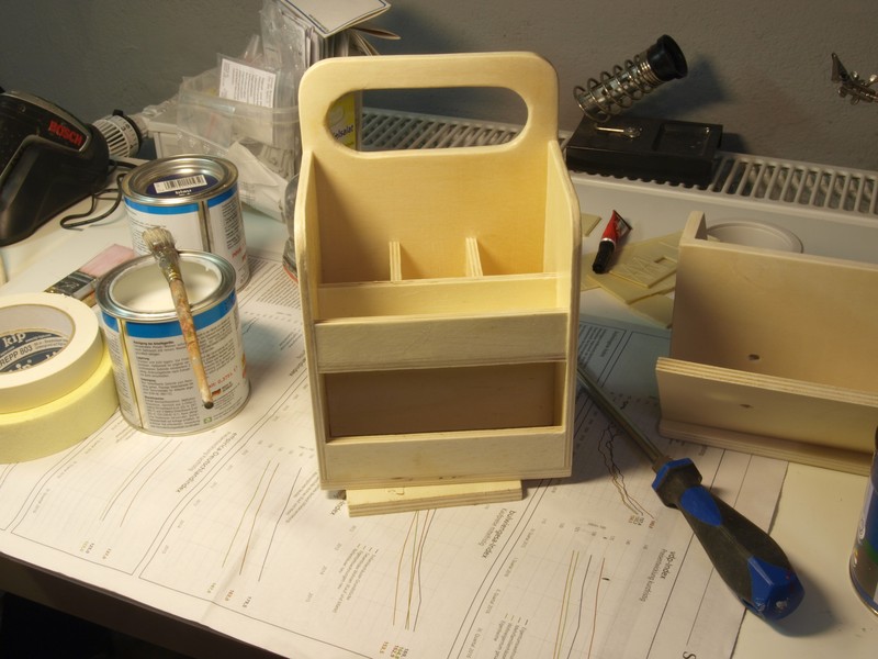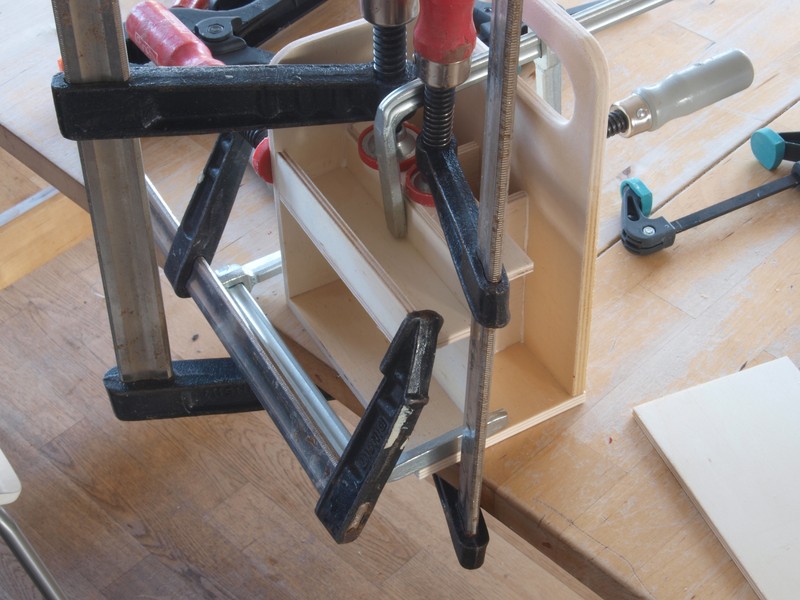 Weil ich hier schweren Inhalt herumtrage, habe ich die Seitenwände mit dem Boden des Kastens verschraubt. Ansonsten ist wieder alles verleimt.