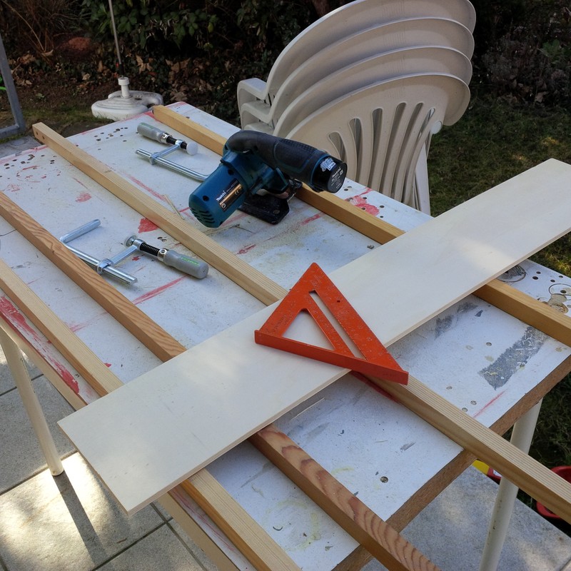 Beim Zusägen der größeren Teile habe ich auf meine kleine Akku-Kreissäge zurückgegriffen, die dank einer selbstgebauten Schiene für längere Schnitte besser geeignet ist als die Modellbautischkreissäge.