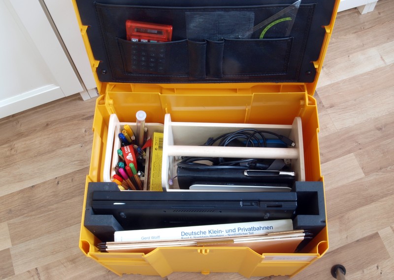 Meine neueste Errungenschaft ist ein Laptop-Systainer. Das ist ein Systainer Größe 4 mit einem Bodenpolster, einem Deckeleinsatz für Stifte und Kleinkram und zwei U-Profilen aus festem Schaumstoff, die in den Systainer geklebt werden und den Laptop beim Transport festhalten.