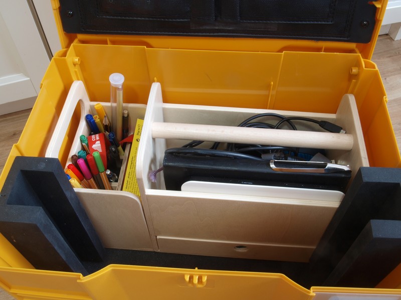 Da es jedoch wenig hilfreich ist, das Zubehör einfach in den Systainer zu kippen, habe ich mir aus Sperrholz Einsätze gebaut, in denen ich das Schreibzeug und das Computerzubehör (Netzteil, Maus, Kabel, USB-Sticks) verstaue.